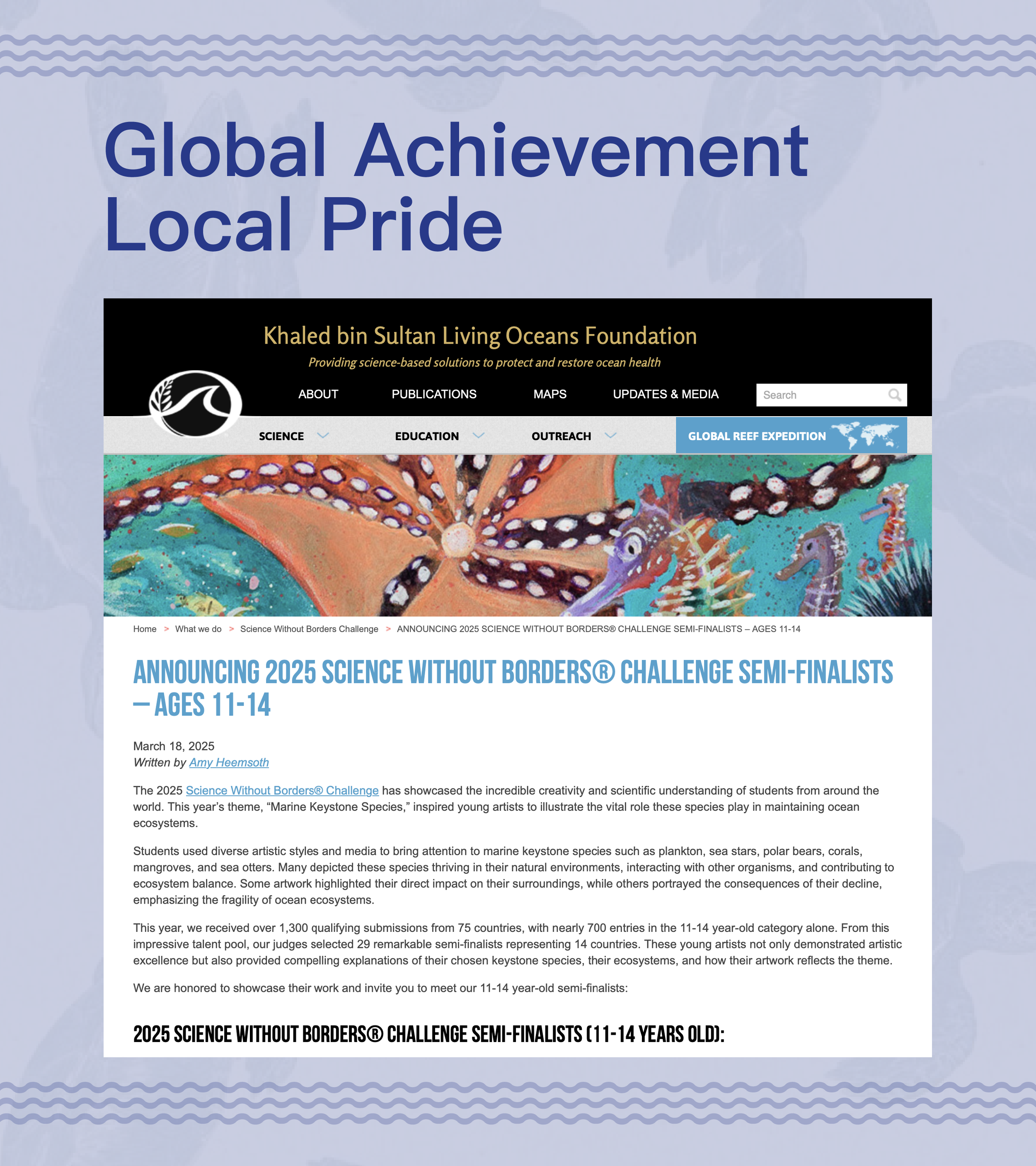 The Science Without Borders® Challenge is an international art competition hosted by the Khaled bin Sultan Living Oceans Foundation, open to students aged 11 to 19 worldwide. The annual contest inspires students to creatively raise awareness about the importance of ocean conservation, helping to protect, restore, and preserve our marine ecosystems.