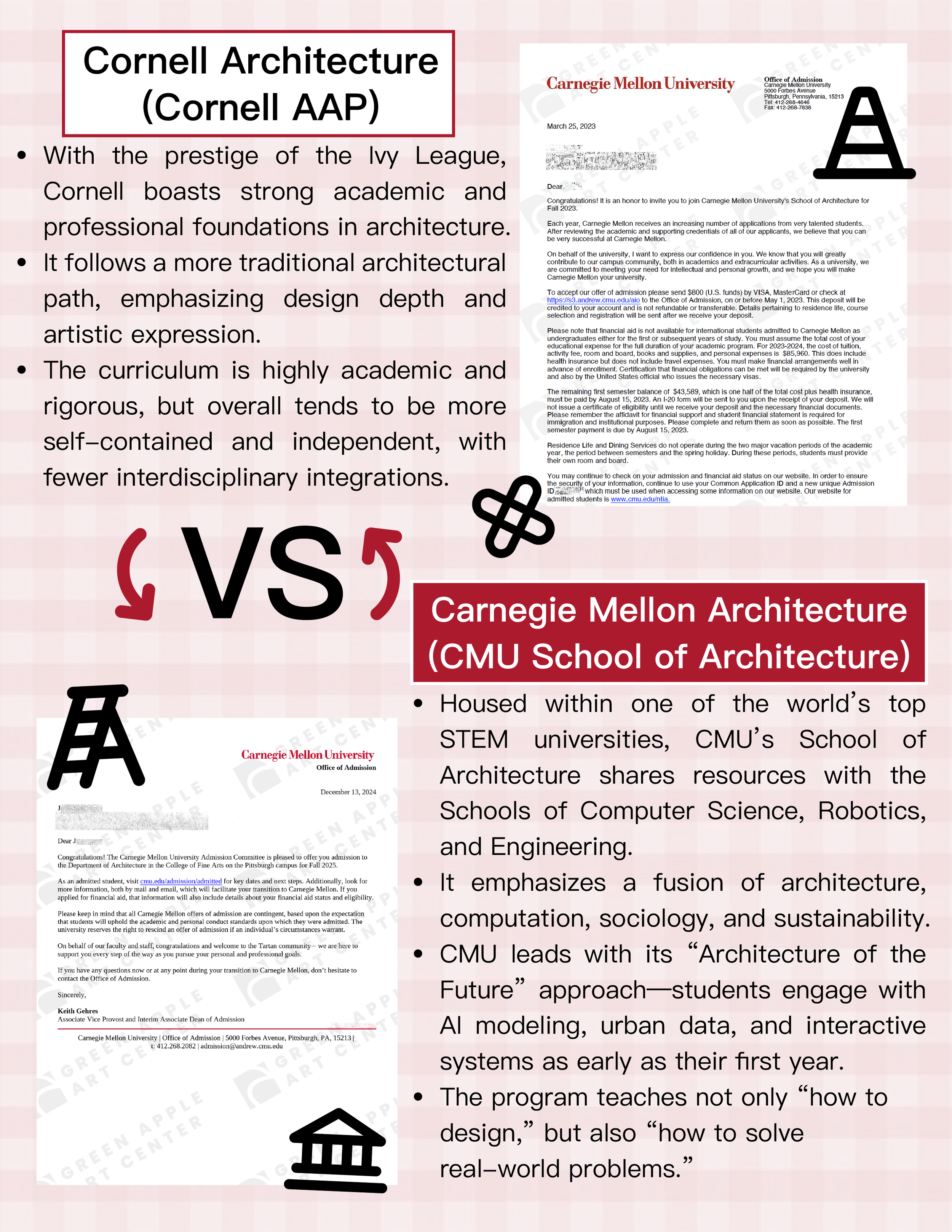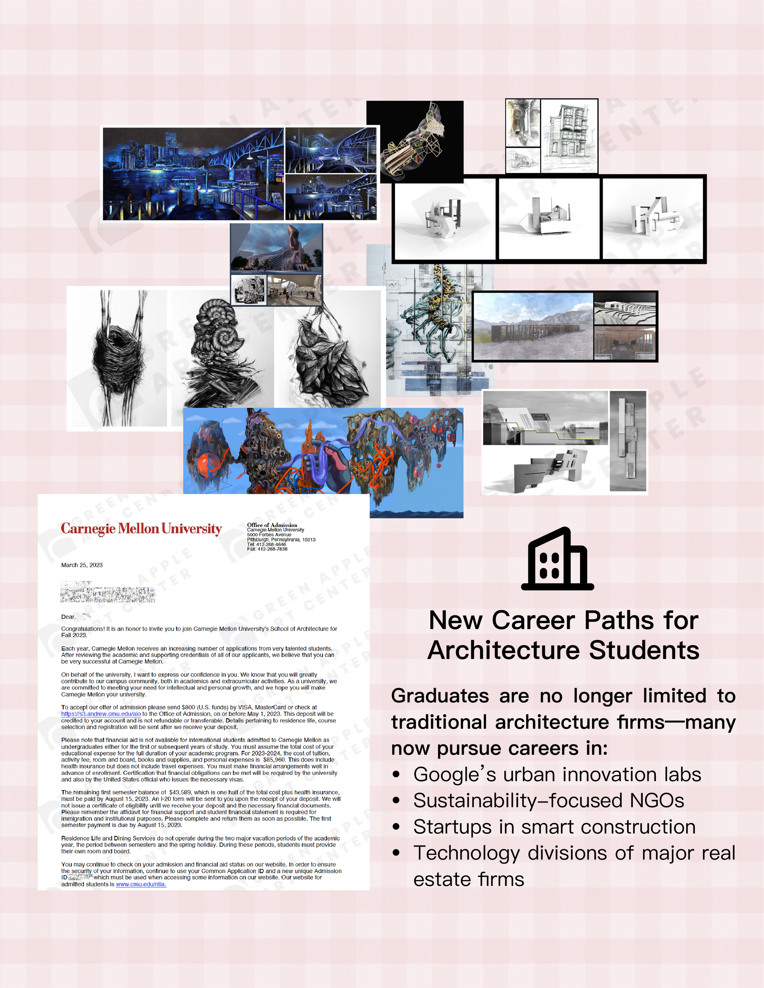 Over the years, we’ve successfully helped students gain admission to CMU Architecture, MIT Media Lab, UCL Bartlett, and other top interdisciplinary programs worldwide.